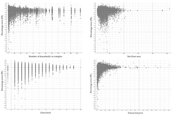 Figure 4 is a scatter diagram illustrating the percentage error by variable. Note that the percentage error (PE) is defined as the difference between the actual transaction price and the predicted value, divided by the actual transaction price. Through scatter diagrams, various insights can be obtained regarding percentage errors. Firstly, the errors show a similar distribution of overestimation and underestimation. Out of a total of 63,306 transactions, 33,015 cases had a percentage error of 0 or higher (underestimation), while 30,291 cases had a percentage error of less than 0 (overestimation). However, extreme predictions tend to occur with overestimations. In cases where the prediction differs from the actual transaction by more than 100%, no underestimations were observed (no cases with PE > 1). In contrast, there were 190 cases of overestimation (PE < −1). Secondly, the percentage error varies depending on the feature. The top left scatter diagram in