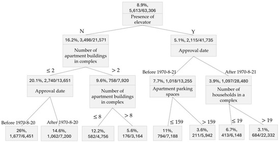Figure 5, neither gross floor area nor net floor area is presented, which suggests that while the size of the property is important for price prediction, it does not significantly contribute to prediction errors once the area is accounted for. It is important to note that there are no missing values for gross floor area and net floor area. This indicates that the model performs well across properties of all sizes. However, analysis of the decision tree reveals that the size of the apartment complex (number of units or buildings) and the age of the building significantly impact predictive performance. Variables such as the number of apartment buildings in a complex, apartment parking spaces, and the number of households in a complex are all related to the size of the apartment complex. It can be observed that the smaller the apartment complex, the lower the prediction accuracy. At each branching point, the segments corresponding to smaller complexes show a higher proportion of errors exceeding 20% compared to other segments. Additionally, it was found that the older the approval date, the lower the predictive accuracy. Interestingly, the presence of an elevator encompasses both these attributes. In apartment complexes without elevators, the absence of an elevator may be due to the buildings being too old or the complex being small (comprising low-rise buildings). This analysis using the decision tree method provides valuable insights into when the appraisal model may yield higher errors, thereby informing better usage of the model.