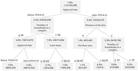 Figure 6 presents the decision tree used to classify cases with a percentage error of 50% or higher. Similar to the previous example, we can analyze the decision tree to identify the conditions of features that lead to significant percentage errors. Out of the total 63,306 transactions, 1121 transactions have a prediction error of 50% or higher (1.8%, the top node). For transactions involving properties with an approval date prior to 21 August 1970, 978 out of 29,036 transactions exhibited a prediction percentage error exceeding 50%. In contrast, properties approved after 21 August 1970, showed only a 0.4% (143 out of 34,270) prediction percentage error in transactions. This indicates that properties with a more recent approval date tend to have relatively smaller prediction errors. Following the left node of the decision tree, for properties with fewer units (fewer than 90 units in the apartment complex), 4.6% of the transactions (738 out of 16,072) had an absolute percentage error exceeding 50%. On the other hand, following the right node, for properties approved after 21 August 1970, and equipped with elevators, only 94 out of 30,789 transactions (0.3%) had an absolute percentage error exceeding 50%.