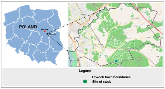 The survey was conducted in October 2023 (20 October 2023) in a forest within the city of Otwock (southern part of the city), located at a distance of 32 km from Warsaw—the capital of Poland—Figure 1. The second-growth forest area is 0.97 hectares, occurs on fresh mixed coniferous forest habitat. Tree species in the cultivation are 2 years of age Scots pine (Pinus sylvestris L.) and beech (Fagus silvatica L.). The clear-cutting area accounts for 3.94 hectares, and occurs also on mixed fresh forest. The mature forest stand occurs on the forest habitat type—fresh forest. The stand is dominated (90%) by Scots pine (Pinus sylvestris L.) aged 114 years, the remaining 10% of the area is occupied by Scots pine (Pinus sylvestris L.) aged 79. Stand density is moderate. The meteorological data in effect at the time of the experiment were determined using data from the nearest meteorological station—the Meteo Station in Otwock located at an altitude of 94 m above sea level (location: 52°6′55.729″ N and 21°14′15.418″ E). The average daily temperature was 6.3 °C (7.9 maximum °C, 5.3 minimum °C), the relative humidity was 95.52–96.30%, the average cloudiness was 5.3 (on the octane scale), the atmospheric pressure was 1008 hPa, and the wind speed was up to 4.5 m/s. Noise and sunlight levels were controlled during the experiment. Sound and light levels were also measured with an iPhone 12 using the LUX Light Meter FREE and Sound Level Analyzer Lite applications. Similar applications have been used in other studies [10,25], and they meet standards comparable to professional laboratory equipment for sound analysis. Sound and light were measured at each exposure point before, 2× during, and immediately after completing the psychological test questionnaire. The average sound level measured with the sound level meter amounted to 47.6 ÷ 56.5 dB. The mean light intensities in forest amounted to 829 ÷ 881 lx.