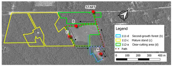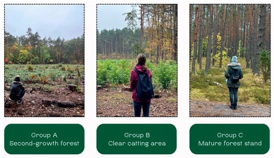 The experiment began at 10 a.m. Each participant in the study arrived at the site alone. The collection site was located at the entrance to the forest, about 100 m from the first study plot. Upon reaching the forest, each volunteer was asked to answer questions on the standardized psychological test questionnaires we used (see Section 2.4 for a description of the tests)—Pre-test. The psychological questionnaires used in the study were anonymous, with the students adopting pseudonyms for the duration of the study. Each questionnaire form, upon completion, was checked by the study supervisors (2 people) for completeness. Subsequently, participants were randomly divided into three groups: A (20 participants) and B (22 participants) and C (22 participants). Each group, along with a researcher guide, went to the forest for the next stage of the experiment. Group A started with an exposition to a second-growth forest, group B—at the same time observed a clear cutting area, and group C—a mature forest stand—Figure 2. All observations were made from the forest roads along which the aforementioned plots were located. The participants were at a distance of about 5 m from each other. The time of exposure to the landscape was 15 min each time. After this time, each respondent again answered the questions included in the psychological tests (Post-test). Each group then rotated visiting the next study area. Group A would go to a road bordered by a clear-cutting area, group B to a road passing through a mature forest stand, and group C would arrive at a second-growth forest. In this way, at each site at the same time there were max. 22 survey participants and each participant viewed both the second-growth forest, clear cutting area and the mature forest stand. All three locations were very close to each other at a distance of about 300 m—Figure 3. All actions taken during the research were in accordance with the ethical standards of the Polish Committee for Ethics in Science and the 1964 Declaration of Helsinki, as amended.