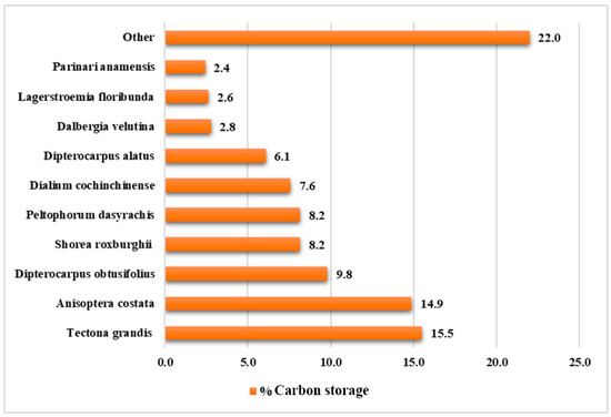 The top ten tree species with the highest potential, as ascertained from the percentage of carbon sequestration in the study area, were Tectona grandis Linn.f., Anisoptera costata Korth, Dipterocarpus obtusifolius Teijsm.ex Miq., Shorea roxburghii G.Don, Peltophorum dasyrachis (Miq.) Kurz, Dalbergia cochinchinensis Pierre, Dipterocarpus alatus Roxb, Dalbergia velutina Benth., Lagerstroemia floribunda Jack, and Parinari anamensis Hance, respectively (Figure 3).