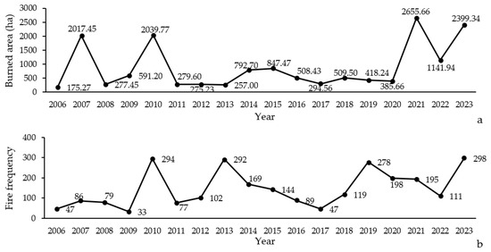 Figure 2. Variation in extent (a) and frequency (b) of forest fires occurring in Northern Zagros from 2006 to 2023.