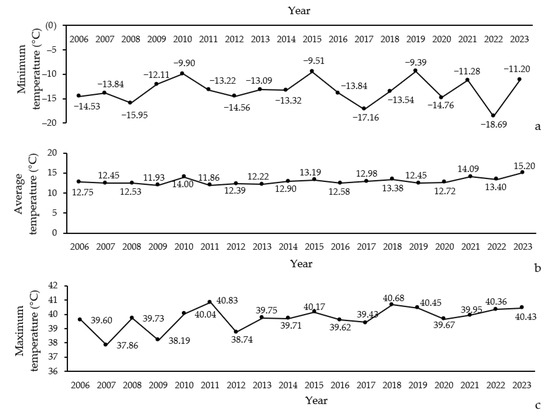 Figure 3. Trends in minimum (a), average (b), and maximum (c) temperatures over time (2006–2023) in Northern Zagros.