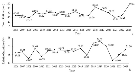 Figure 4. Annual variation in precipitation (a) and relative humidity (b) levels (2006–2023) in Northern Zagros.