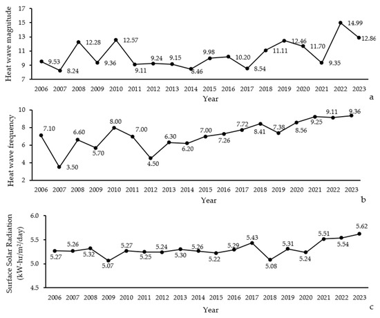 Figure 6. Annual variation in heat wave magnitude (a), frequency (b), and surface solar radiation (c) in Northern Zagros from 2006 to 2023.