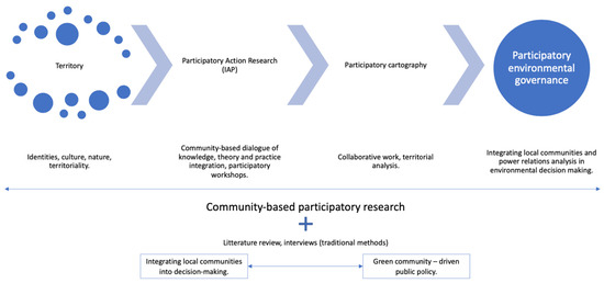 The Participative Action Research methodology (IAP)—which was proposed by Orlando Fals Borda—was the basis for the participatory work in this study [63,64]. The community was given a leading role in the research through the exchange of knowledge, integrating theory and practice to analyze environmental conflicts and representations of ways of inhabiting a territory [65]. This approach promotes education in being, doing, knowing, and feeling and gives the community the ability to actively engage in the analysis of conflicts [66,67,68,69].