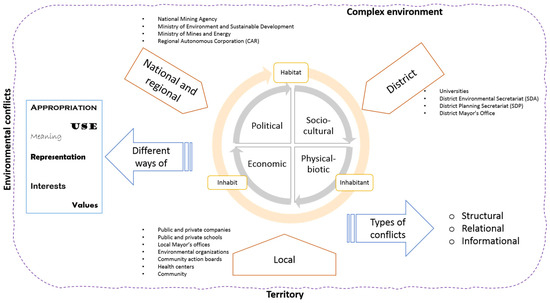 Figure 3 offers a graphic representation of the complexity of environmental conflicts, as interpreted by research participants. The graphic illustrates the network of demands, interests, and conflicts that arise from mining activities, highlighting the interactions between different modes of habitation, and the political, sociocultural, economic, and physical–biological aspects of the territory. The three dimensions of territory are represented by the central circle, which are (i) the physical habitat, (ii) the way in which such spaces are inhabited, and (iii) the symbols and practices that the inhabitants rely on to support their way of life. In this sense, the four quadrants that make up the central circle each represent a different aspect of the territory. The cultural and social elements of the habitat, such as social interactions, customs, and community values, are highlighted in the socio-cultural quadrant. The economic quadrant is made up of the commercial, livelihood, and resource-extraction sectors of the economy that have an impact on the habitat. The ecosystem, biodiversity, and environmental health are among the natural and biological elements of the habitat that are the focus of the physical–biological quadrant. The political quadrant, which includes governance, policies, and territorial control, is a representation of the political dynamics and power relations that shape the habitat.