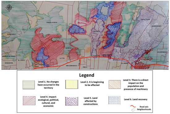 The areas that are currently impacted by operating quarries are identified at Level 4, with a focus on the implications for the population and their cultural dynamics, the absence of political authority, the prioritization of commercial interests, the complete alteration of the main ecological framework, modifications to the geomorphology, and the loss of animal habitats. The neighborhoods built along the Eastern Hills that were directly impacted by the establishment of quarries in the area are examples of Level 5 areas—those that cannot be ecologically restored due to their political–administrative structure.