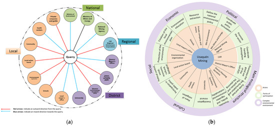 A participatory exercise helped to illustrate the complexity of the relationships, and the multiplicity of institutional actors involved [76], directly and indirectly, in the management, regulation, control, and decision-making processes related to the quarries in the area. Figure 6 shows how the students analyzed the characterization of the “social fabric” [77,78].