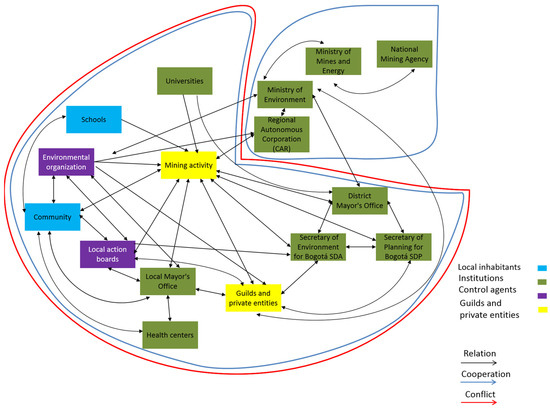 To maintain regulatory oversight, participants identified district-level institutional actors that were not directly involved in the local mining operations. These actors included the District Planning Secretariat and the District Environment Secretariat. Their relationships with the mining industry and the community are established by the Land Use Plan and the Bogotá Mayor’s Office. Academic institutions are included in this list as well, since their research indirectly mitigates the negative effects of mining on the areas that are highlighted in Figure 7. Although there was less engagement with the local community and their specific concerns, the CAR was included in decision-making and regulation issuance at a more strategic level.