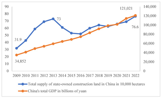 Supplement of state-owned construction land (10,000 hectares) and total GDP (billions of yuan) in China.
