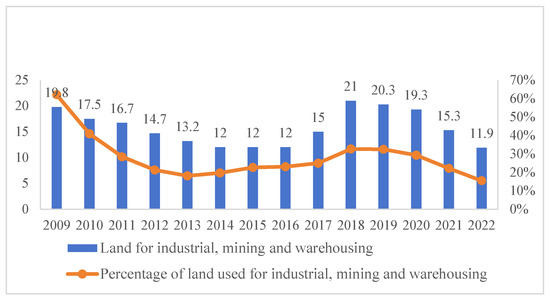 Land (10,000 hectares, %) used for industrial, mining, and warehousing in China.