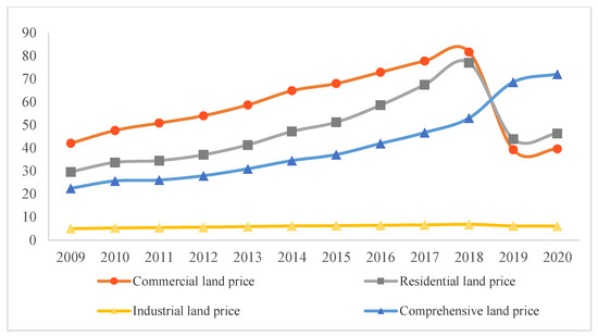 The root cause of LRM lies in the fact that the Chinese approach to land allocation is characterized by both a market economy and a planned economy, which is determined by the way in which land is granted in China. The Regulations on Tendering, Auctioning, and Listing of State-owned Land Use Rights, promulgated by the Chinese government, stipulate that China’s public land transfer methods include listing, auctioning, and tendering, whereas agreement transfer refers to the transfer of state-owned land use rights by municipal and county land resource management departments to land users by way of an agreement, which is a transfer method that is strongly colored by government intervention. The direct cause of China’s LRM phenomenon is that the fiscal decentralization brought about by the reform of the tax system has changed the behavior of China’s local governments; i.e., corporate income tax has become a major revenue source for local governments, which have therefore become keen on cultivating their tax base by attracting foreign investment. In order to obtain construction funds, in terms of quantity, local governments have raised the supply of industrial, mining, and warehousing land in large quantities, which has been maintaining a high proportion in China, as shown in Figure 2; in terms of price, the cost of industrial land has been artificially depressed to sustain the competitive advantage of manufacturing goods by keeping their prices at a lower level. As depicted in Figure 3, the long-term trend reveals that the prices of industrial land in China have consistently remained subdued [12]. Effective allocation of resources has always been the basic problem of economics research, and it has always been the cutting-edge topic of economic development [13]; the academic research on the consequences of LRM mainly focuses on the regional industrial structure and production efficiency. On the one hand, LRM depresses the cost of land, which leads to the rough utilization of land: a large amount of industrial land is allocated to inefficient enterprises, which leads to the low-level duplication of industrial investment between regions and the ensuing overcapacity [14]; on the other hand, the influx of inefficient enterprises constrains the operational space available to high-tech firms, thereby impeding the overall productivity growth of the city [15]. There is also research on the impact of LRM on the urban environment showing that low-level manufacturing industries inevitably bring a large amount of energy consumption and a large amount of sulfur and nitrogen gas emissions [16], but there is no clear idea on whether the LRM will have an impact on the city’s ability to address natural disasters, as well as how to cope with and solve the urban environmental problems caused by LRM. Based on this, this study endeavors to tackle the issue through the lens of the DE, aiming to address the extent of LRM and mitigate its detrimental effects. This approach not only presents a fresh perspective for comprehending the challenges associated with LRM but also introduces innovative strategies for local governments to effectively counteract and resolve this issue.