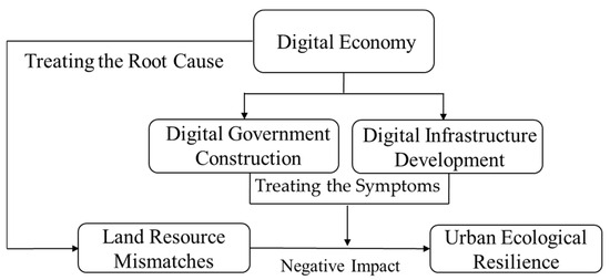 In the era of the digital economy (DE), the traditional economic growth paradigm is no longer applicable. To explore whether the DE can improve the urban ecological problems left behind by rough economic growth, this study examines the effects of land resource mismatch (LRM) on urban ecological resilience (UER) and evaluates the mitigating influence of the DE. This analysis utilizes data from 280 prefectural-level cities in China over the period from 2007 to 2021 and reveals that LRM significantly undermines UER, with this conclusion remaining robust across a series of tests. Additionally, the detrimental impact of LRM on UER is more pronounced in megacities, cities with high levels of economic development, and those with a lower degree of advanced industrial structure. In further analysis, this study finds that the digital economy can optimize the allocation of land resources, thereby enhancing urban ecological resilience, which has the effect of “treating the root causes”. In addition, digital government and digital infrastructure, as key elements of the digital economy, also mitigate the negative impacts of land resource misallocation on urban ecological resilience, having the effect of “treating the symptoms”. Finally, this study proposes policy suggestions such as optimizing ecological layout, deepening land reform, and promoting digital government and infrastructure construction to provide a theoretical basis and practical guidance for local governments to enhance UER and help build a new model of greener, more resilient, and sustainable urban development.