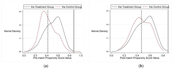 Propensity score plots before and after matching. (a) Propensity score before PSM matching; (b) Propensity score after PSM matching.