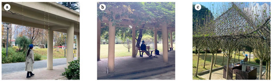 Onsite photos of the three research sites. (a) Jiangan Park (traditional architectural space). (b) Zhixin Park (traditional buildings covered by plants). (c) Plant Weaving Park (living plant architectural space).