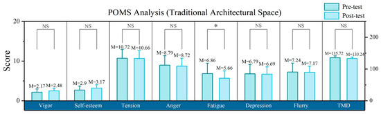 Pre- and post-test alterations in each subscale for the traditional architectural space. The POMS questionnaire data were averaged across five days of the trial, and an independent paired sample t test was utilized, with an α level of 0.05. The data are presented as the means ± SDs. The blue–green rectangles represent the pre-test data, whereas the light blue rectangles represent the post-test data. ‘NS’ indicates that there is no significant difference, and ‘*’ indicates that there is a significant difference. The results revealed that, except for the fatigue subscale (p = 0.047), there were no significant differences in the pre- and post-test subscale and TMD scores.