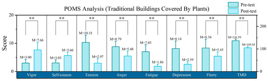 The subjects who experienced the plant-covered traditional architectural space showed extremely significant changes in the seven subscale scores and the TMD scores. Compared with the pre-test scores, the post-test scores revealed a significant reduction of 71% in tension, 38% in anger, 74% in fatigue, 68% in depression, and 35% in flurry. Among the positive emotions, the post-test scores for vigor and self-esteem increased by 155% and 87%, respectively, compared with the pre-test data. The post-test TMD score was 23% lower than the pre-test score. The significance of the differences for the seven subscales and the TMD score was less than 0.001 (p < 0.001). The results are shown in Figure 5.