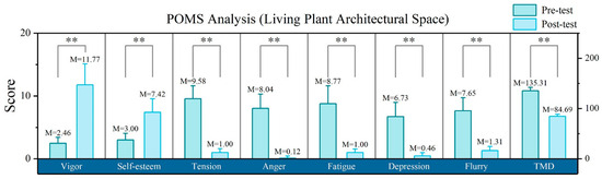 Pre- and post-test alterations in each subscale for the living plant architectural space. The POMS questionnaire data were averaged across five days of the trial, and an independent paired sample t test was utilized, with an α level of 0.05. The data are presented as the means ± SDs. The blue–green rectangle represents the pre-test data, whereas the light blue rectangle represents the post-test data. ‘**’ means that there is an extremely significant difference. The results revealed extremely significant differences between the pre- and post-test scores for the seven subscales and TMD.