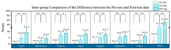 Intergroup comparisons of the differences between the pre- and post-test scores. One-way ANOVA was used to analyze these differences, with an α level of 0.05. The data are presented as the means ± SDs. The light grey rectangle represents the JA site (traditional architectural space), the blue–green rectangle represents the ZX site (traditional buildings covered by plants), and the light blue rectangle represents the PW site (living plant architectural space). ‘**’ means that there is an extremely significant difference. ‘*’ means that there is a significant difference. ‘NS’ indicates that there is no significant difference.