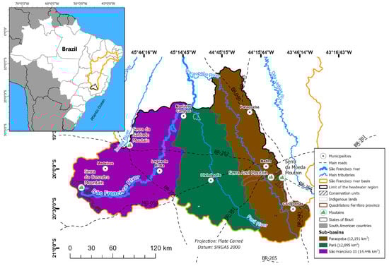 The São Francisco River is one of the most important rivers in Brazil, with a length of 2863 km and a drainage basin covering an area of more than 639,219 km2, corresponding to 8% of the Brazilian territory. It runs from the state of Minas Gerais, where the river rises in the Serra da Canastra Mountain range, to the Atlantic Ocean, where it flows into the border between the states of Alagoas and Sergipe []. The basin’s drainage area covers the Northeast and Southeast regions of the country, covering 505 municipalities in six states.