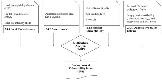 Based on the literature, the available database, and the region’s soil and climate conditions, four variables were selected as the main criteria for defining environmental vulnerability in the study area: Land Use Adequacy, Burned Area, Erosion Susceptibility and quantitative water balance. The flowchart in Figure 2 presents the steps for estimating the environmental vulnerability index in the headwaters of the SFRB.