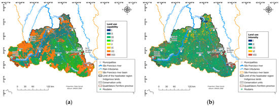(a) Land use capability and (b) land use intensity in the headwaters of São Francisco.