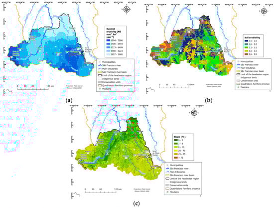In this work, the slope map was calculated using the Digital Elevation Model (DEM) of the study areas, obtained from NASADEM images with a resolution of 30 m []. This map was then rescaled from 0 to 1 to standardize the scale with other erosion susceptibility maps.
