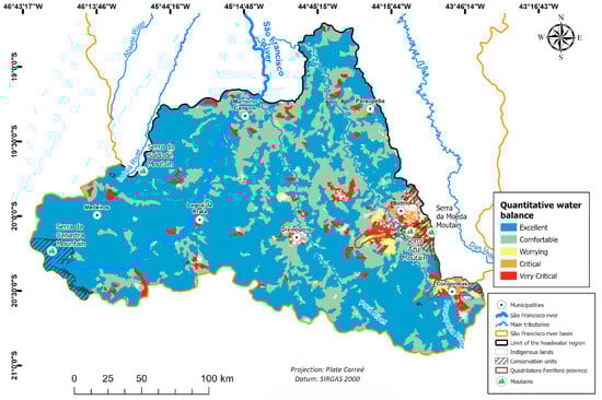 The quantitative water balance in the headwaters of the SFRB (Figure 8) shows that around 93.7% of the basin area has excellent or comfortable water availability. In the remaining 6.3% of the area, availability was classified as worrying, critical, or very critical. For the headwaters of the SFRB, the sub-basins with very critical water availability are mainly located near urban centers, where the demands for human supply and industrial uses are higher.