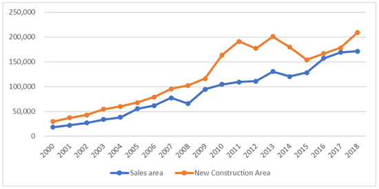 Real estate sales area and new construction area in China, 2000–2018 (square meters) (Source: China Bureau of Statistics).