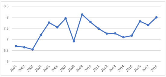 China’s housing price-to-income ratio, 2001–2018 (Source: China Bureau of Statistics, E-house China R&D Institute).