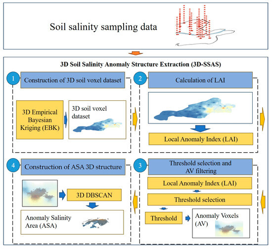 This study proposes an innovative method, 3D Soil-Salinity Anomaly Structure Extraction (3D-SSAS), aimed at extracting the 3D structure of an anomalous-salinity area (ASA) formed by abrupt changes in the soil-salinity concentration. This method first constructs a 3D soil-voxel data set for precisely stratified vertical soil salinity-sampling data using 3D empirical Bayesian kriging (EBK). Then, the concept of a “Local Anomaly Index” (LAI) is proposed to quantify the degree of a soil-salinity anomaly. Based on this index, a threshold is set to divide the data into anomaly voxels (AVs) and normal voxels (NVs). Subsequently, the 3D DBSCAN (density-based spatial clustering of applications with noise) [29] algorithm is used to cluster the AV set in order to accurately identify and construct the 3D structure of the anomalous-salinity area. The primary benefit of this approach lies in its capacity to accurately delineate the complex 3D structure and precise location of anomalous-salinity zones, effectively illustrating the spatial variability in the 3D distribution of soil salinity. This study’s success offers fresh perspectives on soil science research and enhances the modeling precision of soil-salinity distribution models. These improvements significantly increase the accuracy of predictions and decision-making in associated disciplines.
