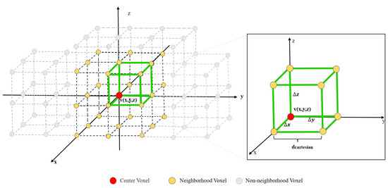 The study defined the concept of a “neighborhood” as illustrated in Figure 3. Consider the current center voxel denoted as v(x,y,z). A local coordinate system is established around the center voxel, v: the z-direction is the normal direction, with x and y directions perpendicular to z. In this coordinate system, a cube is established with v as the centroid and an edge length of 2dcartesian. We defined the neighborhood voxel set Nv of voxel v to be distributed on the 8 vertices and the midpoints of the 12 edges of the cube. In the three-dimensional coordinate system, there is a regular positional relationship between the central voxel, v, and its neighborhood voxel set, Nv. In this coordinate system, the coordinates of the center voxel, v, are (x, y, z), and its neighborhood voxel set, Nv, can be represented as follows: Nv = {x + ∆x, y + ∆y, z + ∆z: ∆x, ∆y, ∆z∈{0, dcartesian, −dcartesian}}. Based on the concept of a neighborhood, the calculation method for LAI is as follows: