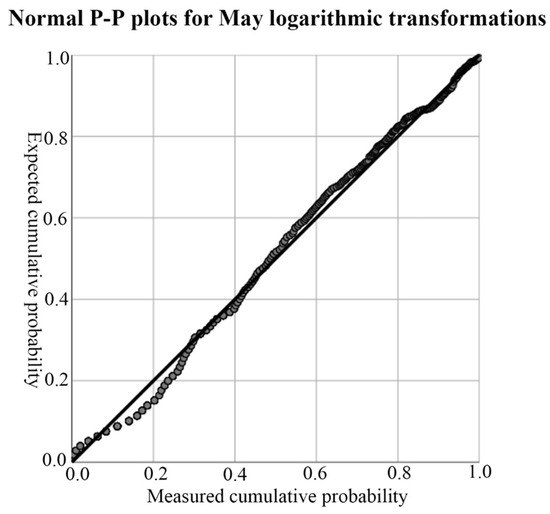 According to the results of the descriptive analysis in Table 2, both of the data were left-skewed, so they did not conform to the normal distribution. Therefore, a logarithmic transformation of the data was necessary to achieve a normal distribution. The P-P normal probability diagram was used to test the normal distribution results after conversion. If the data were normally distributed, the tested data would have basically formed a straight line, and the specific P-P normal probability diagram is shown in Figure 4. According to the results shown in Figure 4, the P-P normal probability chart, the tested data basically formed a straight line; that is, the data after the logarithmic conversion of soil-salt content presented the effect of normal distribution, and the Kriging method could be used for interpolation.