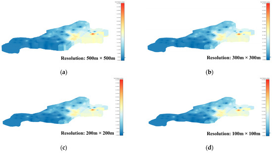 To ensure experimental accuracy, this paper thoroughly examines the limitations of the interpolation method and sets the resolution of the voxel data set to 500 m × 500 m, 300 m × 300 m, 200 m × 200 m, and 100 m × 100 m, respectively. The 3D-SSAS is applied to four distinct data sets, with the results subsequently compared. The data voxel sets of these four resolutions are shown in Figure 5a–d. The overall depth of each data set is 1 m, and it is divided into 10 layers; each layer is 10 cm apart.