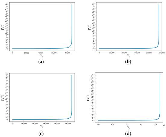 LAI calculation was performed on the above data sets; the sorted LAI sequences are described in Figure 6, and the graph shows the LS curves based on four different-resolution data sets. From the calculation process described in Section 2.3.3, the thresholds dthreshold for data sets of 500 m × 500 m, 300 m × 300 m, 200 m × 200 m, and 100 m × 100 m were 13.46, 13.33, 13.25, and 13.23, respectively.