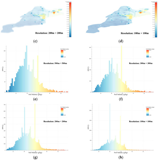 Subfigures (a–d) show the locations of the AV sets in the Kenli soil-salinity data set in different-resolution data sets: Subfigure (a) is for the 500 m × 500 m-resolution data set, subfigure (b) for the 300 m × 300 m-resolution data set, subfigure (c) for the 200 m × 200 m-resolution data set, and subfigure (d) for the 100 m × 100 m-resolution data set. The colors in the figure represent the salinity content of the voxels. To better display the location of the AV sets, we made the other voxels transparent and enlarged the AVs for emphasis. Subfigures (e–h) are histograms of the salinity distribution for the AV sets at 500 m × 500 m, 300 m × 300 m, 200 m × 200 m, and 100 m × 100 m resolutions, where the colors represent the salinity content of the voxels.