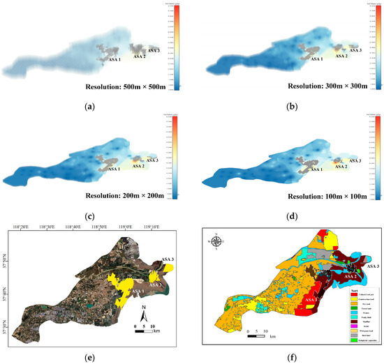 Subfigures (a–d) visualize the extraction results of the 3D-SSAS method using data sets of different resolutions: Subfigure (a) for the 500 m × 500 m-resolution data set, subfigure (b) for the 300 m × 300 m-resolution data set, subfigure (c) for the 200 m × 200 m-resolution data set, and subfigure (d) for the 100 m × 100 m-resolution data set. The gray regions represent the ASAs. Due to the differences in resolution, there are subtle differences in the salinity distribution of each model. In order to better display ASA, the experiment shrinks the voxels of the data set during visualization. Figure (e) shows a two-dimensional image projection (yellow region) of the ASAs at a 100 m × 100 m resolution. Figure (f) shows the projection of ASAs on the land-use map. In the Figure, the black-shaded part is the structure shape of the ASA, and the white-shaded part is the underground shape.