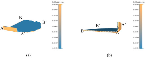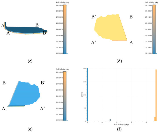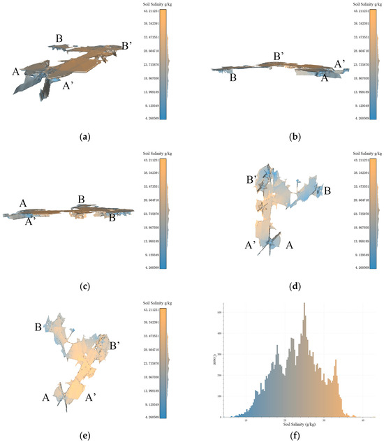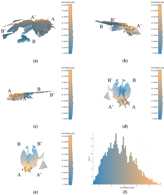 Figure 9a–f show a 3D model describing the 3D structure of the anomalous-salinity area 1 (ASA1) extracted via the algorithm described in this paper, primarily distributed along the Coastal Boulevard in the Kenli District, with central coordinates at 37°40′ N and 119°0′ E. According to the overhead view of the model in Figure 9e, ASA1 resembles the shape of the letter “C”, with the model primarily distributed at the structure and extending eastward from the central region and the end voxels extending north and south underground. Observations of the model’s bottom reveal several depressions at A, B, and B’, which, as seen from the side views in Figure 9b,c, extend down to 1 m below the ground. The ASA1 model shows a salinity pattern that is lower in the east and higher in the west, indicating a rising trend in soil salinity from the inland to coastal regions. As shown in Figure 8f, the model has a similar number of voxels on either side of the 24 g/kg boundary, marking it as an anomalous-salinity area.
