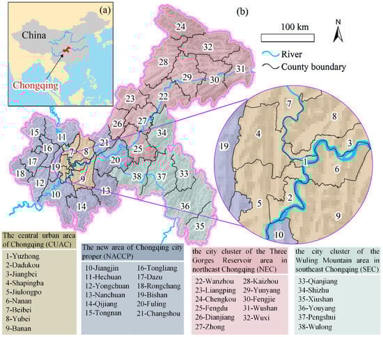 Overview of the study area. (a) Location of Chongqing in China; (b) the administrative division and functional division of Chongqing Municipality.