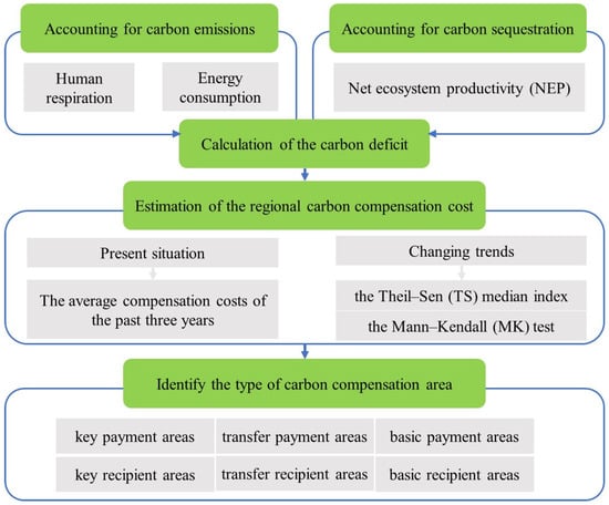 The flowchart of this methodology is shown in Figure 2. Based on the research objectives, we constructed carbon emission accounting, carbon sequestration accounting, actual carbon deficit calculation, carbon compensation cost estimation, and carbon compensation zoning methods, which were organized into the following five parts.