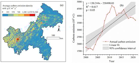 Spatiotemporal distribution of carbon emissions in Chongqing from 2000 to 2022. (a) The spatial distribution of average carbon emission density; (b) the annual distribution of total carbon emissions.