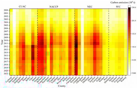 Figure 5 illustrates the regional and temporal distributions of carbon emissions in more detail. Although the area of the CUAC is generally small, the carbon emissions are high. Yubei District reached the highest county carbon emissions in 2012, reaching 231.42 × 104 t. The number of counties in the NACCP region is large, and carbon emissions were generally high, with Hechuan and Jiangjin Districts reaching 224.27 × 104 t and 204.6 × 104 t of emissions, respectively, in 2011. In the NEC region, the Wanzhou and Kaizhou Districts also reached high levels of carbon emissions of 249.1 × 104 t and 218.76 × 104 t in 2011, respectively; however, in 2011, the annual carbon emissions of Wushan, Wuxi, and Chengkou County were lower than 89.1 × 104 t. In addition, the annual carbon emissions of the six counties in the SEC region were relatively uniform, and the highest level was only 92.93 × 104 t, which was reached in Pengshui Autonomous County in 2011. In terms of temporal distribution, the period from 2009 to 2017, when Chongqing’s total carbon emissions were higher than 4000 × 104 t, was also the period of concentrated distribution of carbon emissions in various counties. Especially in 2011, twenty-five (65.79%) counties, such as Yuzhong, Hechuan, Wanzhou, and Pengshui, reached their peaks, which is generally consistent with the temporal distribution of total carbon emissions.