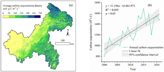 Spatiotemporal distribution of carbon sequestration in Chongqing from 2000 to 2022. (a) The spatial distribution of average carbon sequestration density; (b) the annual distribution of total carbon sequestration.