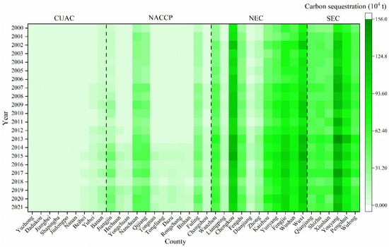 For carbon sequestration at the county level (Figure 7), the carbon sequestration capacity varied greatly between regions, while the annual variation was relatively small. In general, the carbon sequestration capacities of CUAC, NACCP, NEC, and SEC were enhanced successively. In the CACU region, Banan District achieved the highest value in 2020, at only 25.08 × 104 t. The carbon sequestration in the NACCP region was relatively high, but only Qijiang and Nanchuan Districts reached more than 50 × 104 t in some years after 2014. In 2015, the counties in the NEC region had greater carbon sequestration, with Chengkou, Wuxi, and Fengjie Counties peaking at 134.84 × 104 t, 131.68 × 104 t, and 108.49 × 104 t, respectively. Carbon sequestration is generally high in SEC counties, with Xiushan Autonomous County reaching a minimum of 32.08 × 104 t in 2000 and Youyang Autonomous County reaching a maximum of 155.58 × 104 t in 2013. Although there were also 11 (28.95%) counties whose carbon sequestration was in sync with Chongqing’s total carbon sequestration, peaking in 2015, this result was more complex than the anthropogenic carbon emission growth process.