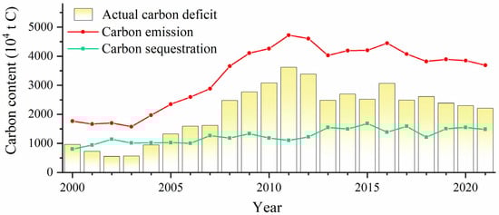Between 2000 and 2021, Chongqing’s total carbon emissions and carbon sequestration both increased but at different rates. Figure 8 compares the differences in their growth processes and describes the changes in the carbon deficit resulting from their subtraction. Chongqing’s carbon emission baseline was greater than its carbon sequestration baseline and grew faster, resulting in a fluctuating trend of widening carbon deficit between 2000 and 2021. Specifically, the lowest carbon deficit was 556.24 × 104 t in 2002, meaning that Chongqing’s total carbon emissions were always greater than its carbon sequestration. The highest value was 3621.58 × 104 t in 2011, and since then, the downward trend of carbon deficit follows that of carbon emissions.