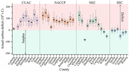 Distribution of carbon deficits by county from 2000 to 2021. For each boxplot, the boxes display the first quartile, median, and third quartile, the black dots represent the mean values, and whiskers represent the values of Q25 − 1.5*(Q75 − Q25) and Q75 + 1.5*(Q75 − Q25).