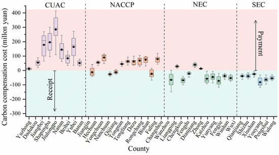 On the basis of the carbon deficit, we integrated lateral population, administrative area, and economic data to estimate the carbon compensation costs across counties (Figure 10). Because the carbon compensation cost is not entirely determined by the carbon deficit, the data for some counties that remained in deficit were corrected. During 2000–2021, only Jiangjin, Qijiang, Fuling, and Wanzhou Districts maintained a transition in the payment and receipt of carbon compensation costs. Fourteen (36.84%) counties, such as Youyang Autonomous County (CNY −119.6~−32.32 million), Fengjie County (CNY −116.74~−20.59 million), and Nanchuan District (CNY −42.08~−10.07 million), which were from the SEC, NEC, and NACCP regions, respectively, received compensation costs every year. The remaining 20 (52.63%) counties paid compensation costs, and they are located in the CUAC, NACCP, and NEC regions; these counties include Jiulongpo District (CNY 109.5~413.36 million), Rongchang District (CNY 28.44~104.73 million), and Dianjiang County (CNY 19.96~55.44 million).