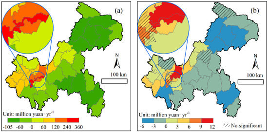 The results of the present situation and trend analysis of carbon compensation in each county during 2000–2021 are shown in Figure 11. Figure 11a illustrates the average carbon compensation cost in the past three years; 20 counties had a payment status, and 18 counties had a recipient status, accounting for 52.63% and 47.37%, respectively, of the total. The highest average payment for Yuzhong District was CNY 359.83 million. In contrast, Youyang Autonomous County paid the lowest average of CNY −104.71 million, indicating that it should receive the most compensation. Figure 11b shows the trend analysis of the carbon compensation costs from 2000 to 2021; 18 counties experienced an increase, and 20 counties experienced a decrease, accounting for 47.37% and 52.63%, respectively, of the total. Specifically, the increase trend was significant (p < 0.05) in 15 (39.47%) counties, and the compensation cost paid by Yuzhong District increased the fastest, reaching CNY 11.18 million per year. In the other 17 counties, the downward trend was significant, with the compensation cost paid by Wanzhou District decreasing the fastest, reaching CNY −4.64 million per year.